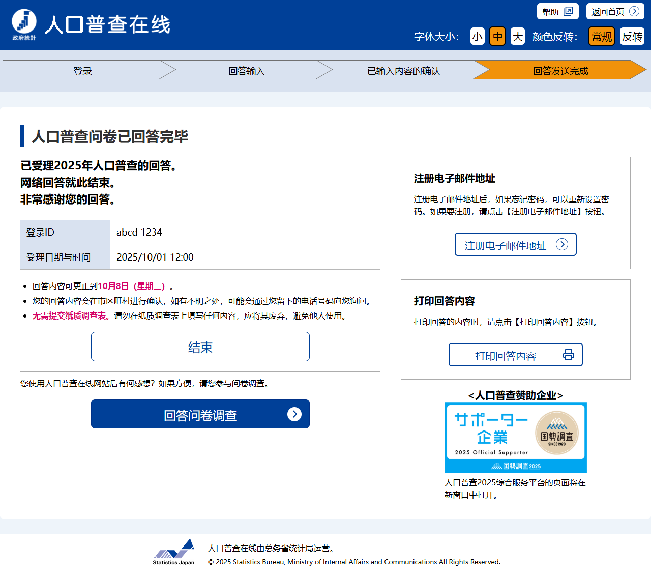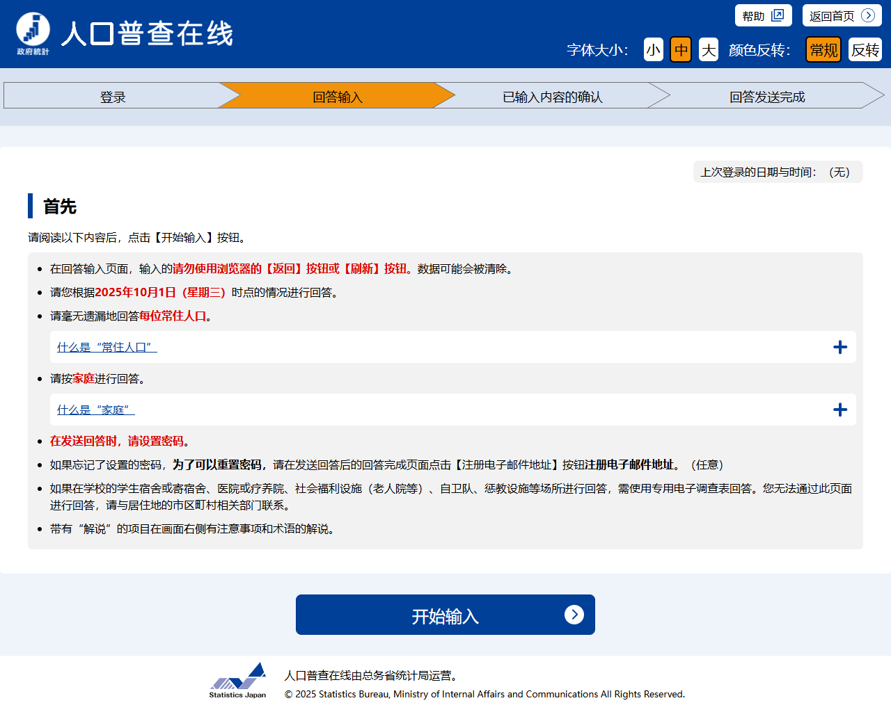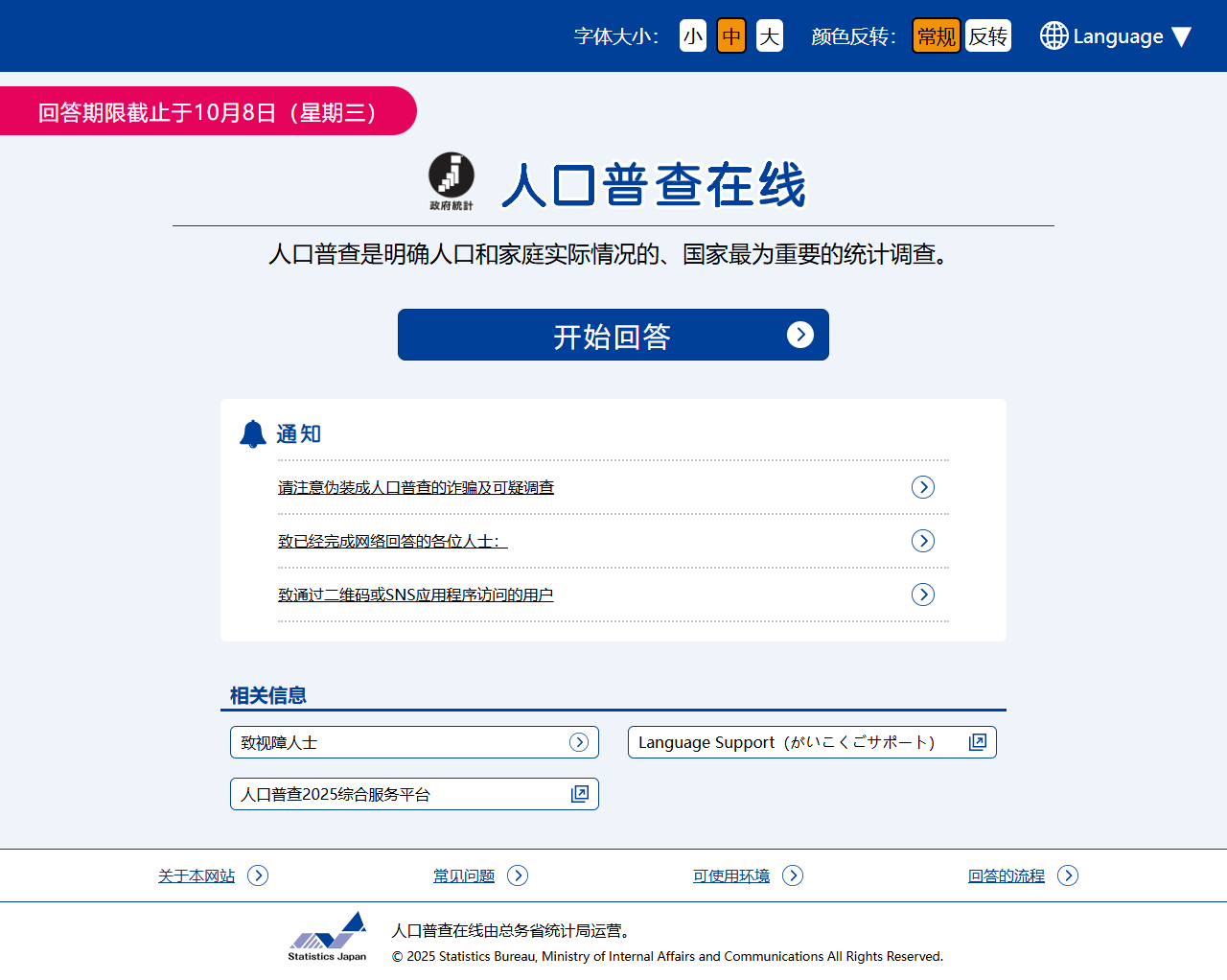 - 一“人口普查在线”是经由网络受理总务省统计局实施的2025年人口普查回答的信息系统。
