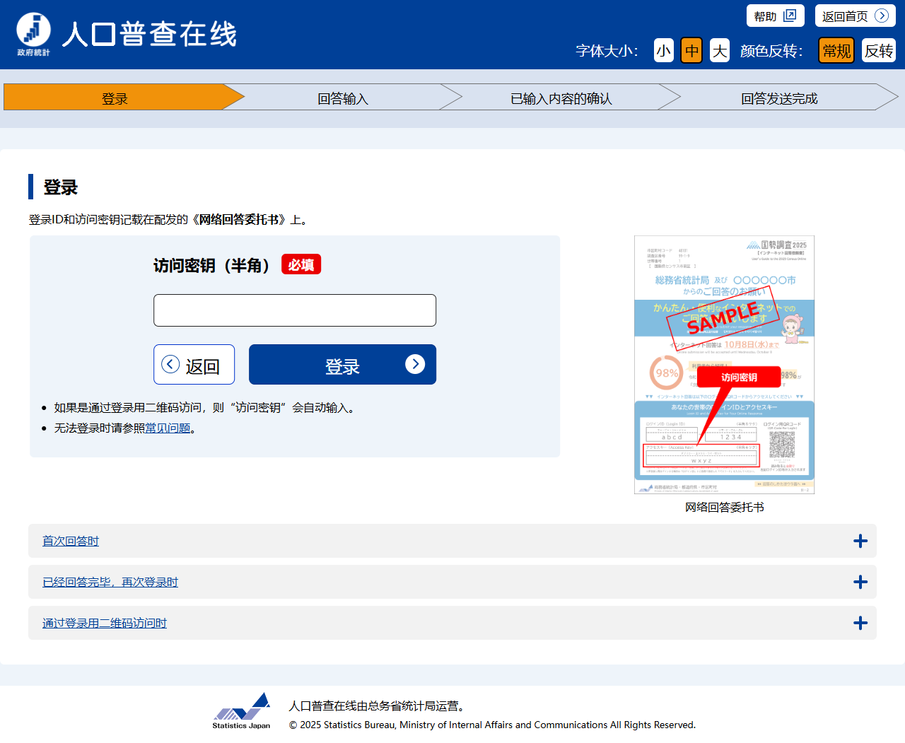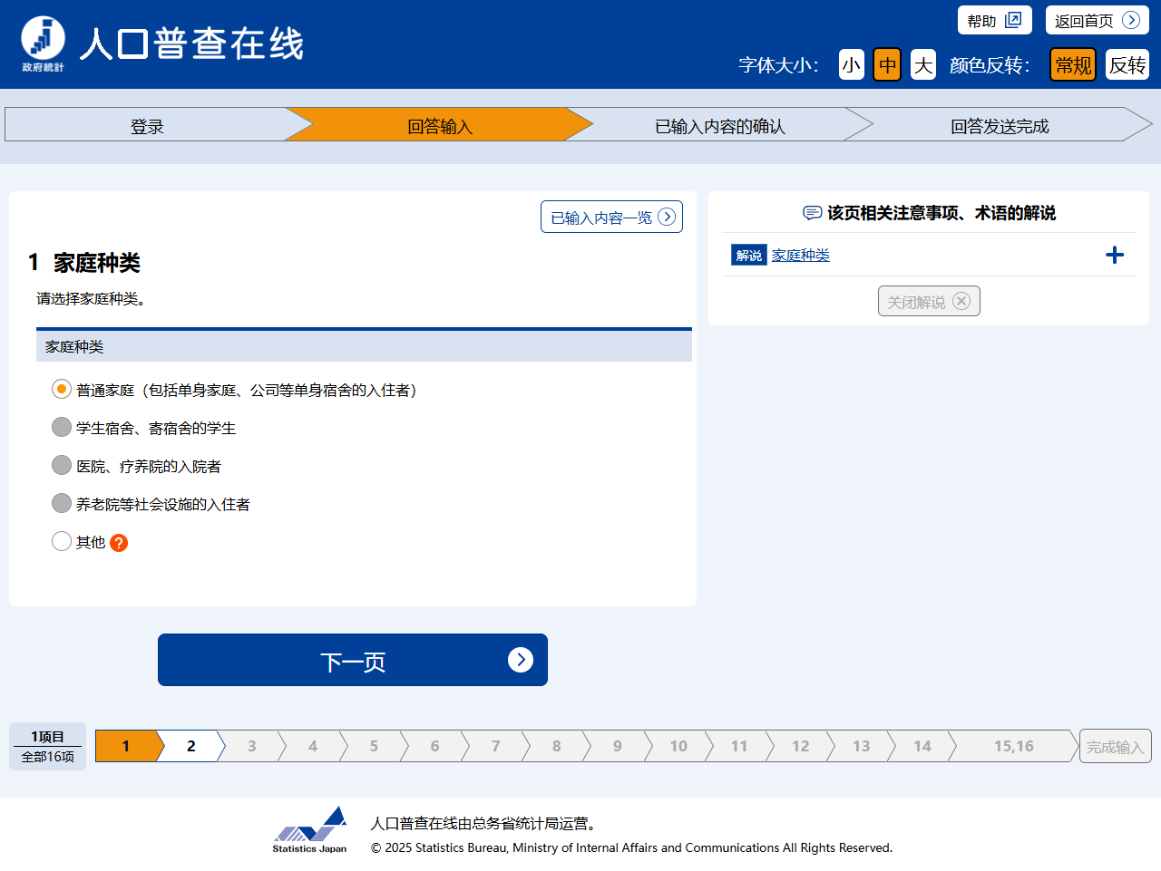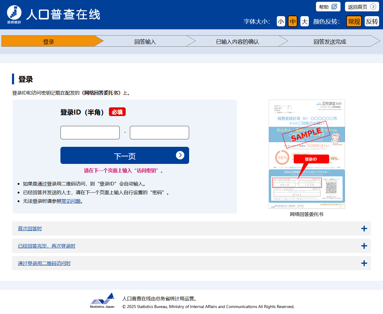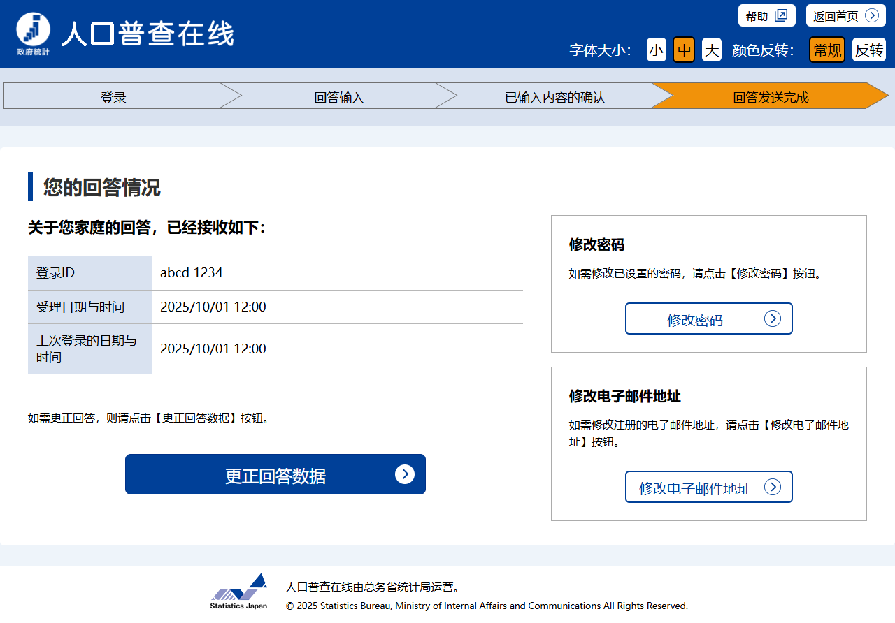 - 一“人口普查在线”是经由网络受理总务省统计局实施的2025年人口普查回答的信息系统。