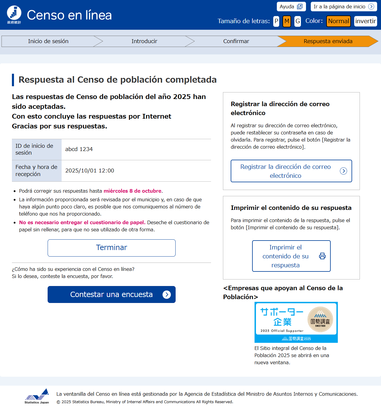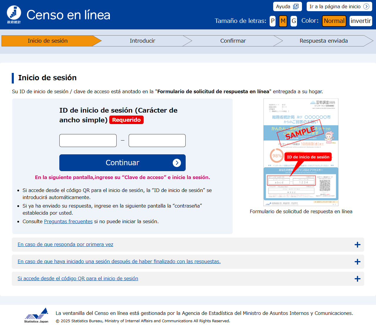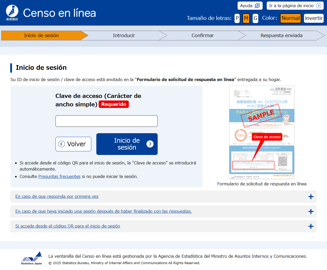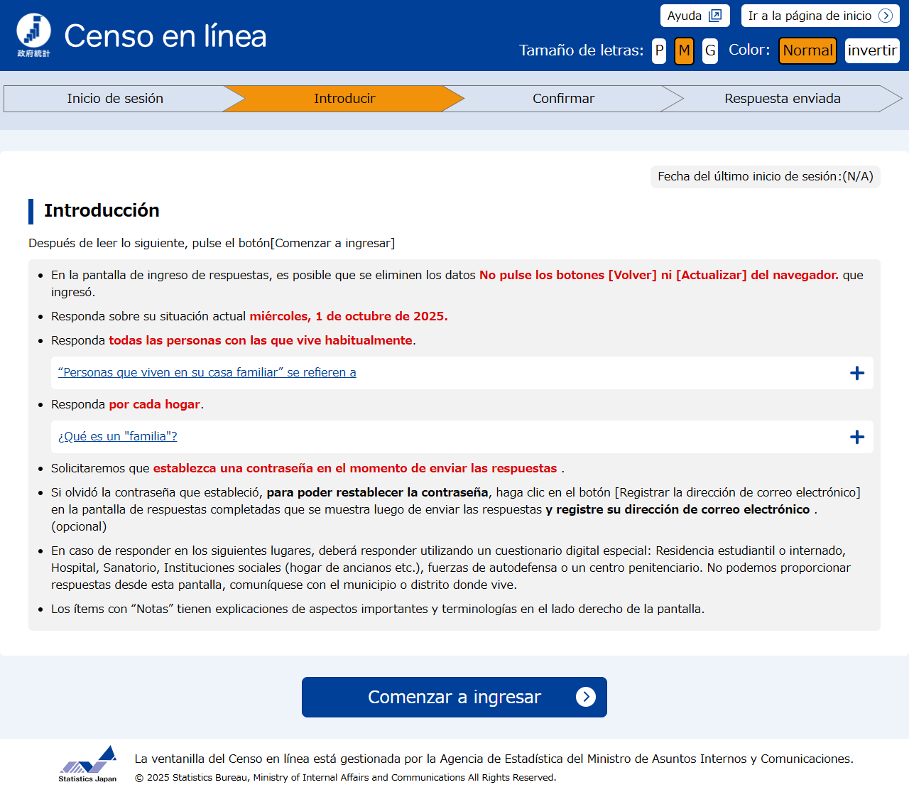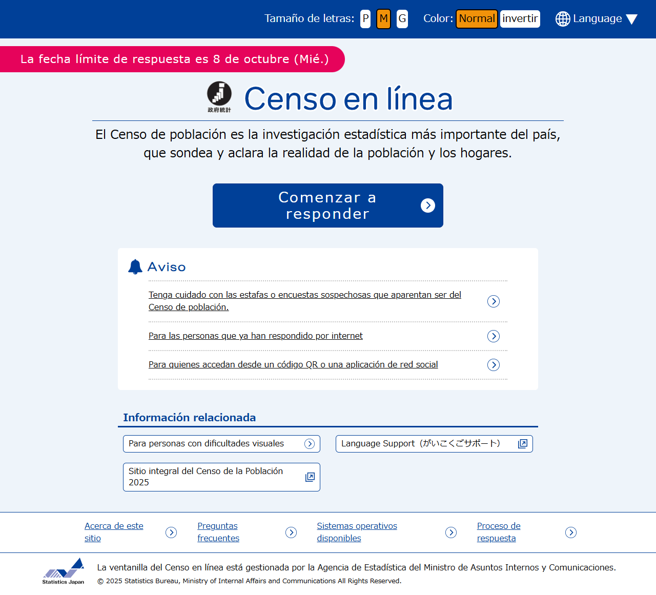 - A. “Censo en línea” es el sistema informático que procesa la recepción de las respuestas de la Censo de población del año 2025 operado por la Agencia de Estadística del Ministerio de Asuntos Internos y Comunicaciones a través de Internet.