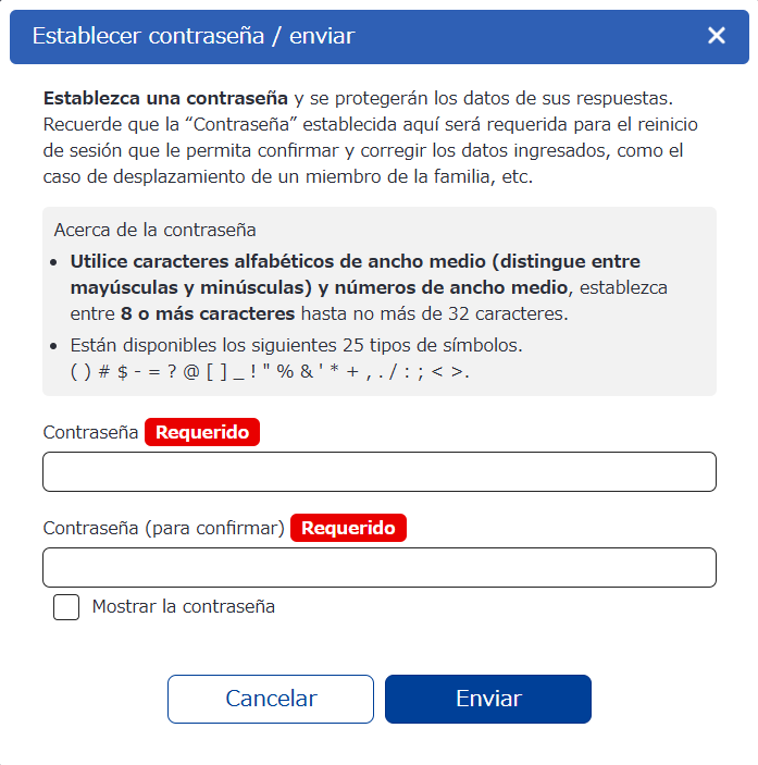 - E.“Contraseña” define una cadena de caracteres que el usuario mismo configura para proteger los datos ingresados e identificar al usuario para corregir los datos ingresados.