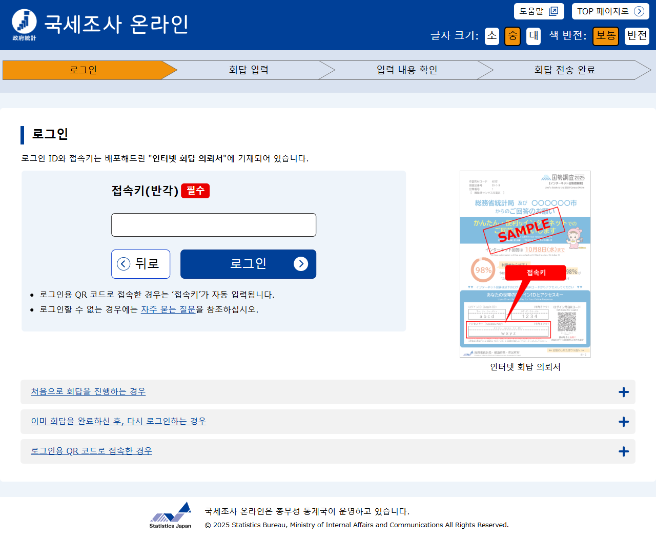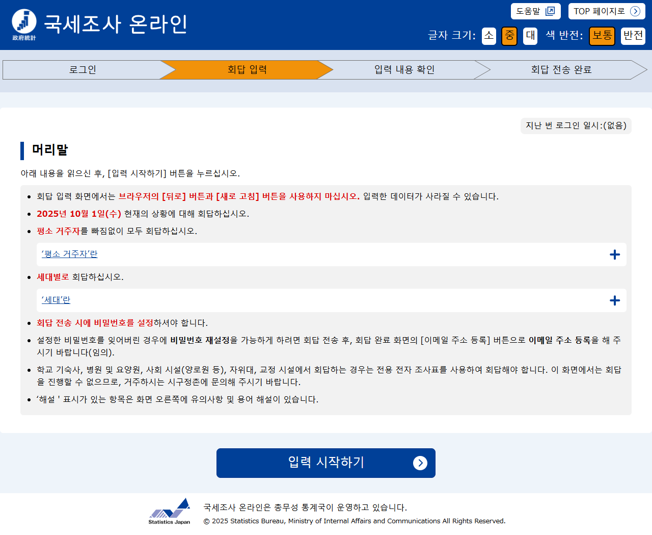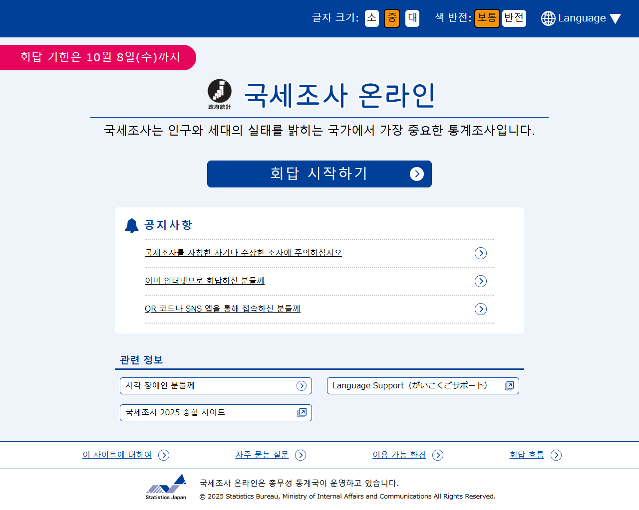 - 가‘국세조사 온라인’이란 총무성 통계국이 실시하는 2025년(레이와 7년) 국세조사의 회답을 인터넷을 통해 접수 처리하는 정보 시스템을 가리킨다.