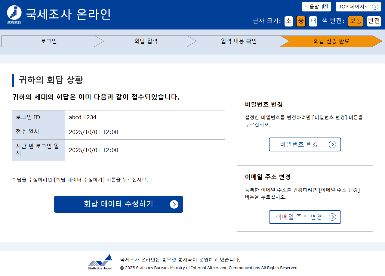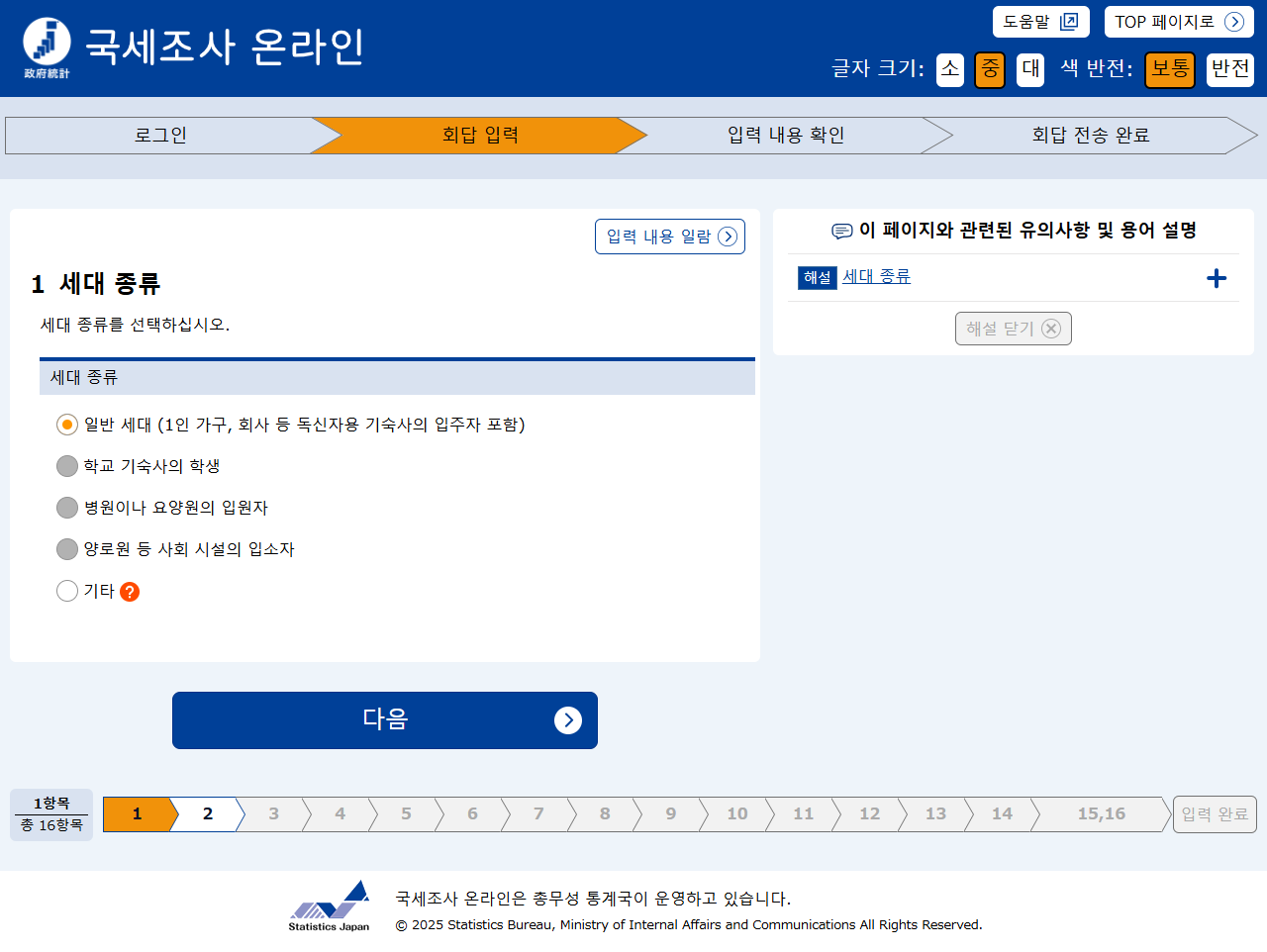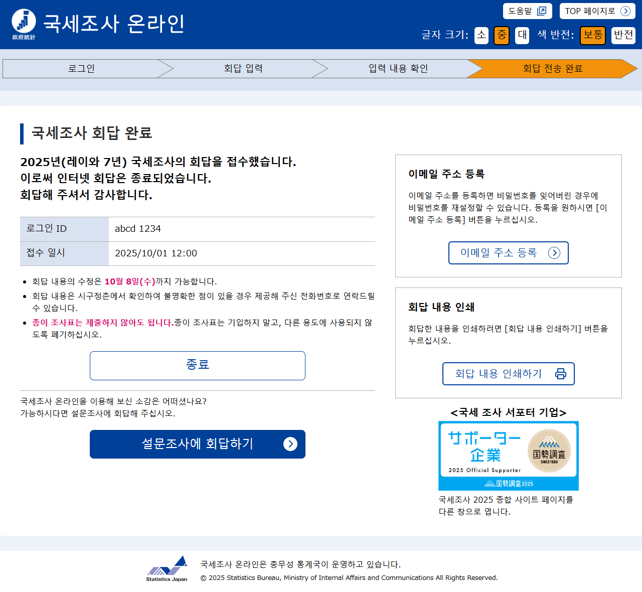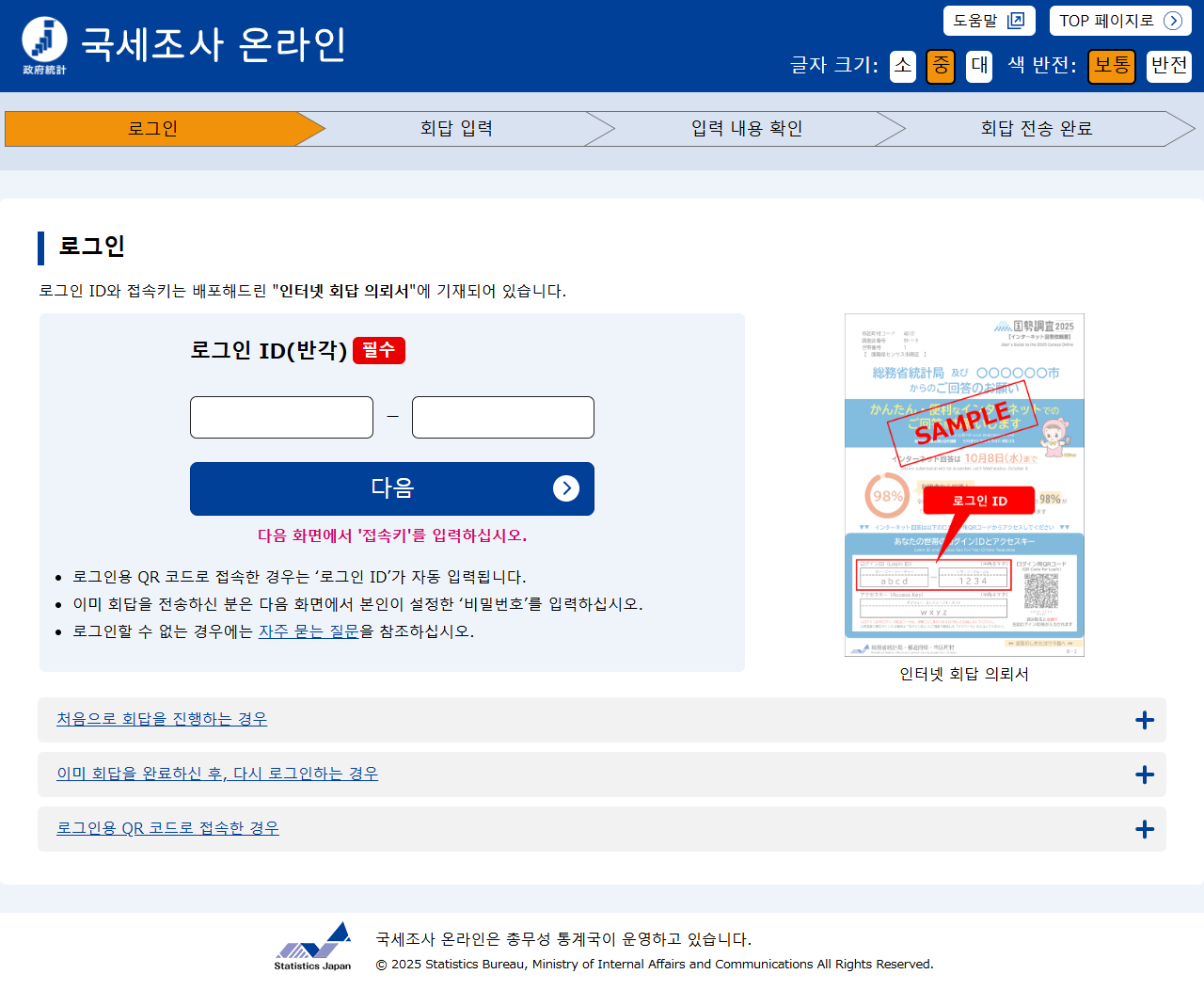 - 가‘국세조사 온라인’이란 총무성 통계국이 실시하는 2025년(레이와 7년) 국세조사의 회답을 인터넷을 통해 접수 처리하는 정보 시스템을 가리킨다.
