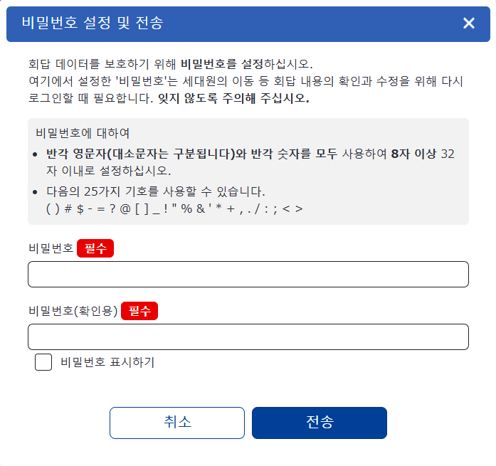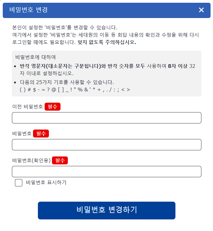 - 마‘비밀번호'란 회답 내용의 보호 및 시스템 이용자가 회답 내용을 수정할 때 인증에 사용하는 시스템 이용자 본인이 설정하는 문자열을 가리킨다.