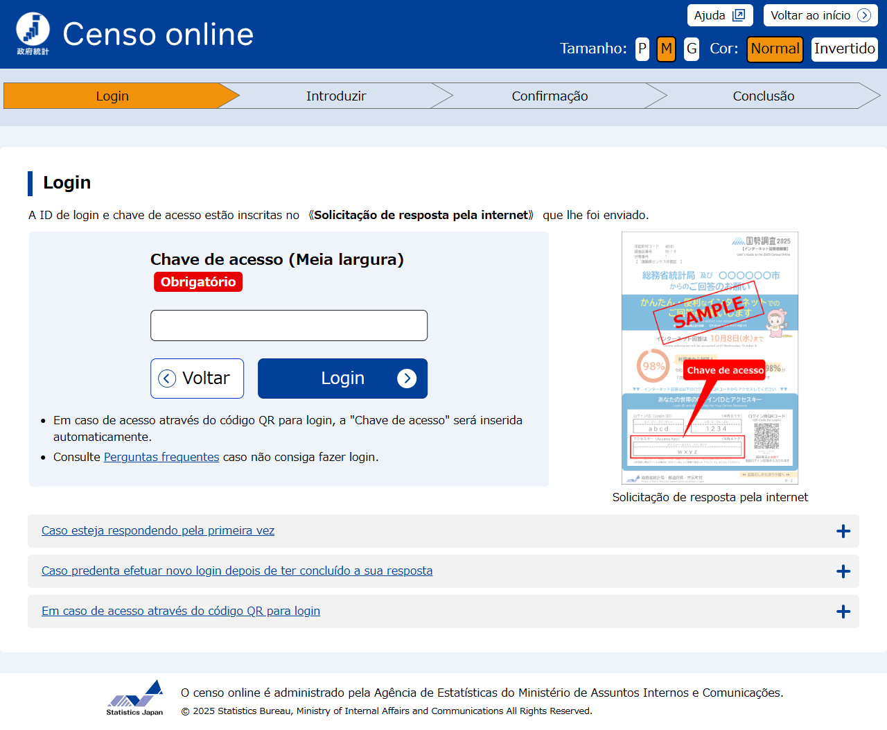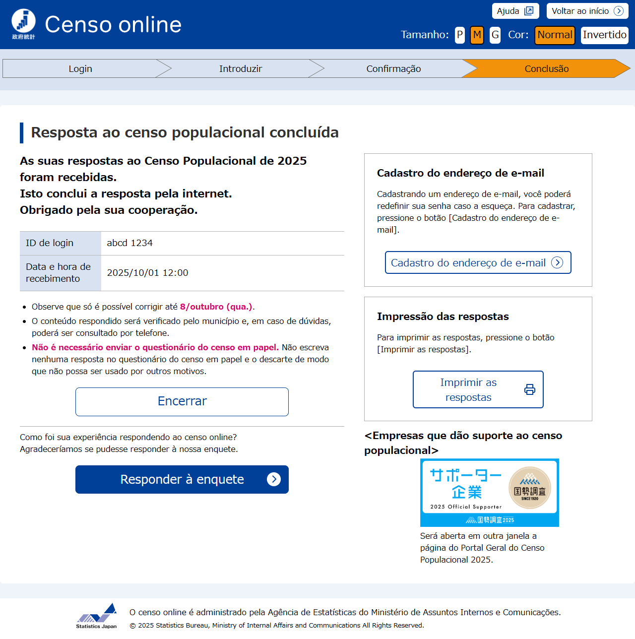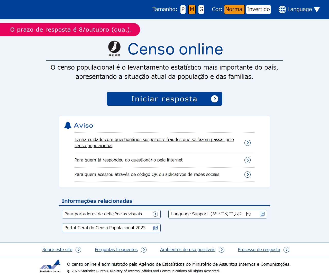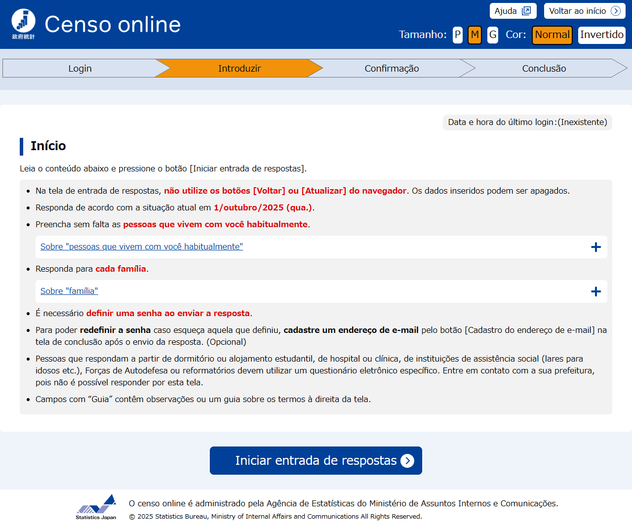 - I"Censo online" designa o sistema de informações para processar as respostas fornecidas pela internet ao Censo Populacional de 2025 realizado pela Agência de Estatísticas do Ministério de Assuntos Internos e Comunicações.