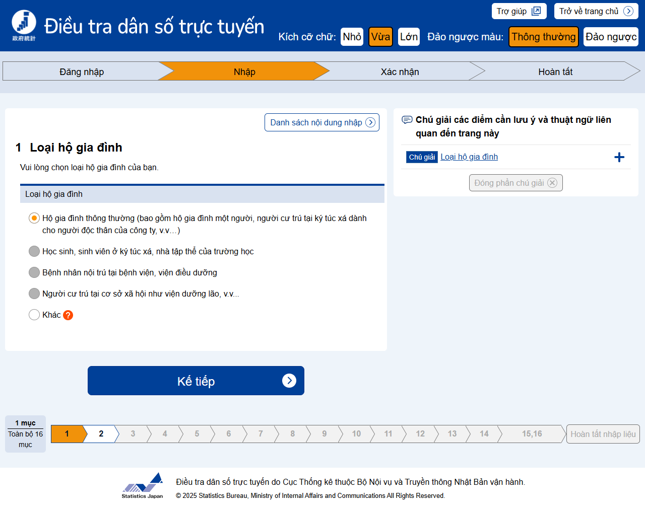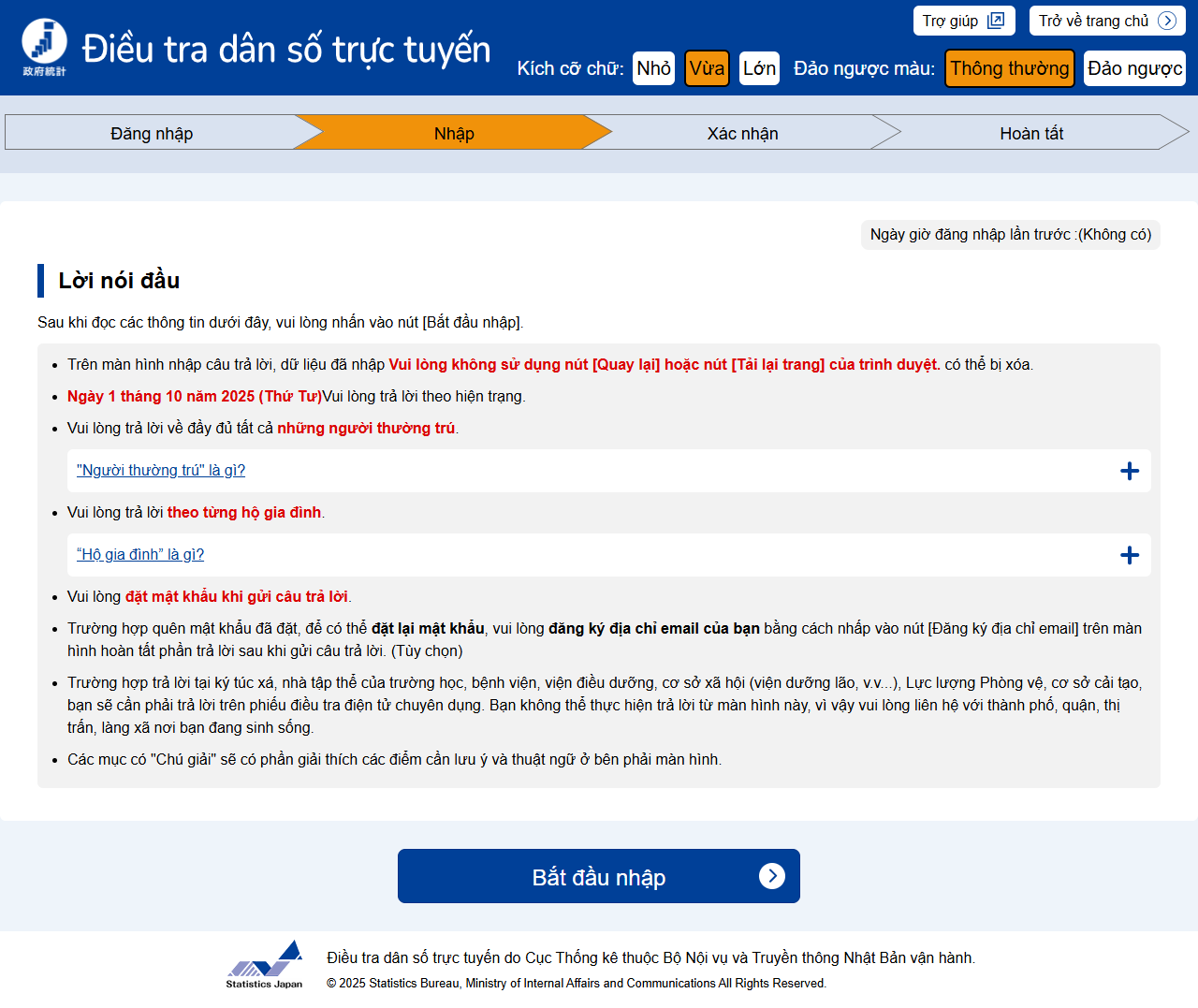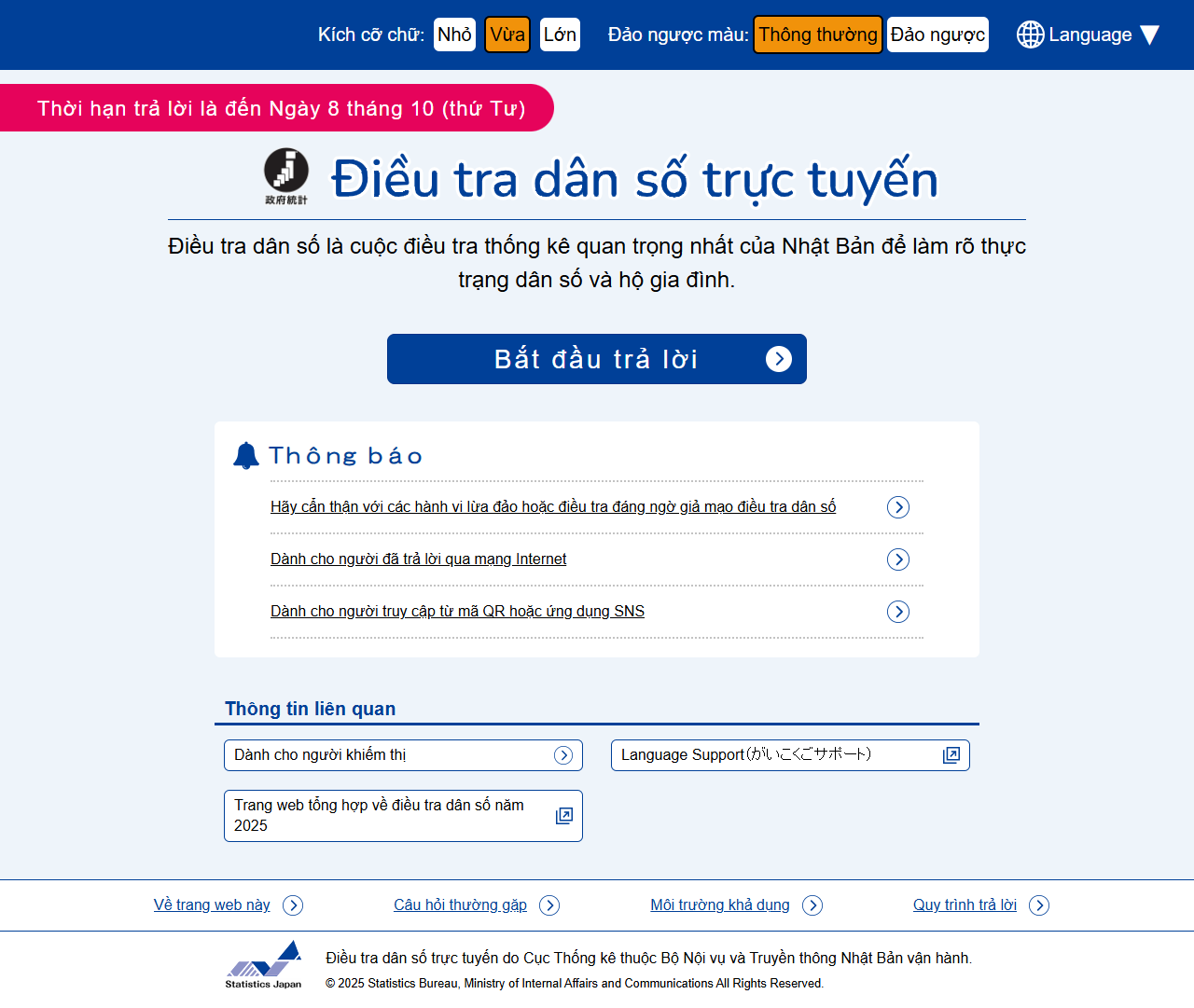- 1. “Điều tra dân số trực tuyến” là hệ thống thông tin tiếp nhận và xử lý các câu trả lời của Điều tra dân số năm 2025 qua mạng Internet, do Cục Thống kê thuộc Bộ Nội vụ và Truyền thông Nhật Bản thực hiện.