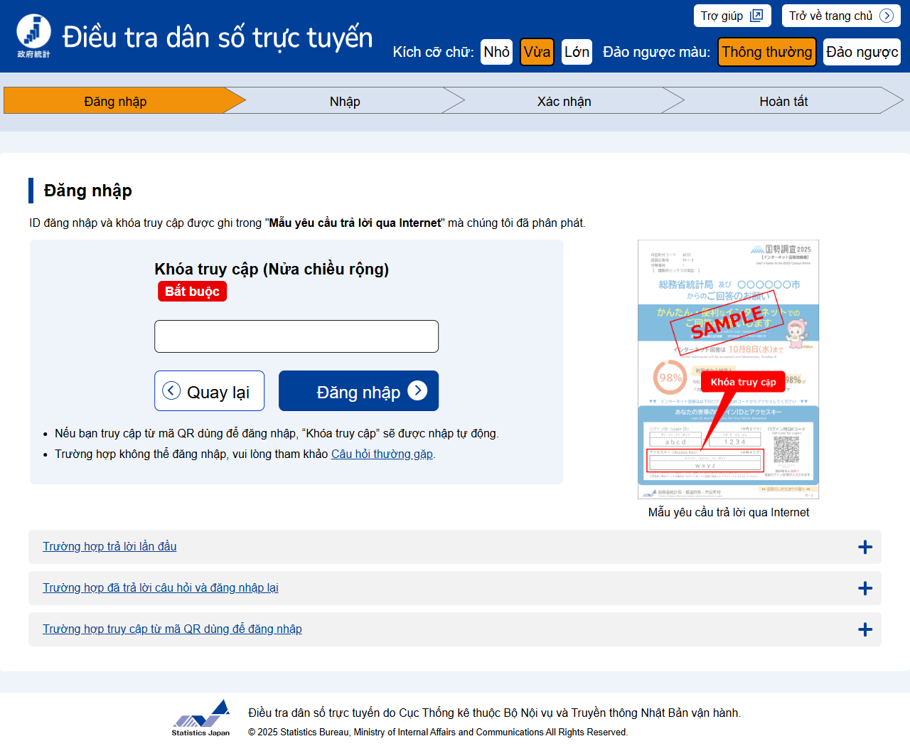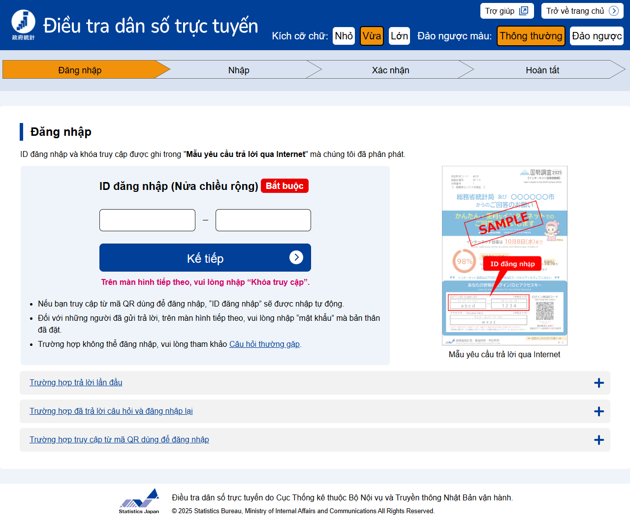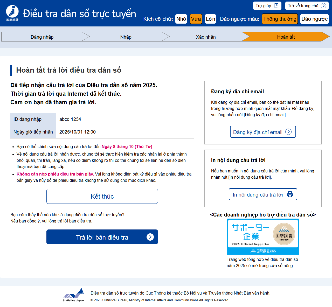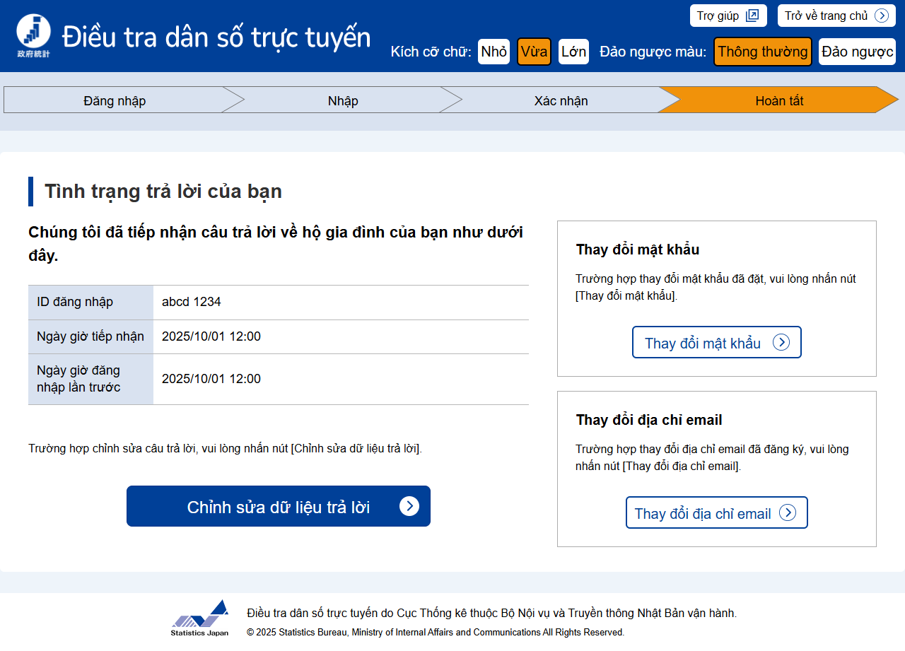 - 1. “Điều tra dân số trực tuyến” là hệ thống thông tin tiếp nhận và xử lý các câu trả lời của Điều tra dân số năm 2025 qua mạng Internet, do Cục Thống kê thuộc Bộ Nội vụ và Truyền thông Nhật Bản thực hiện.