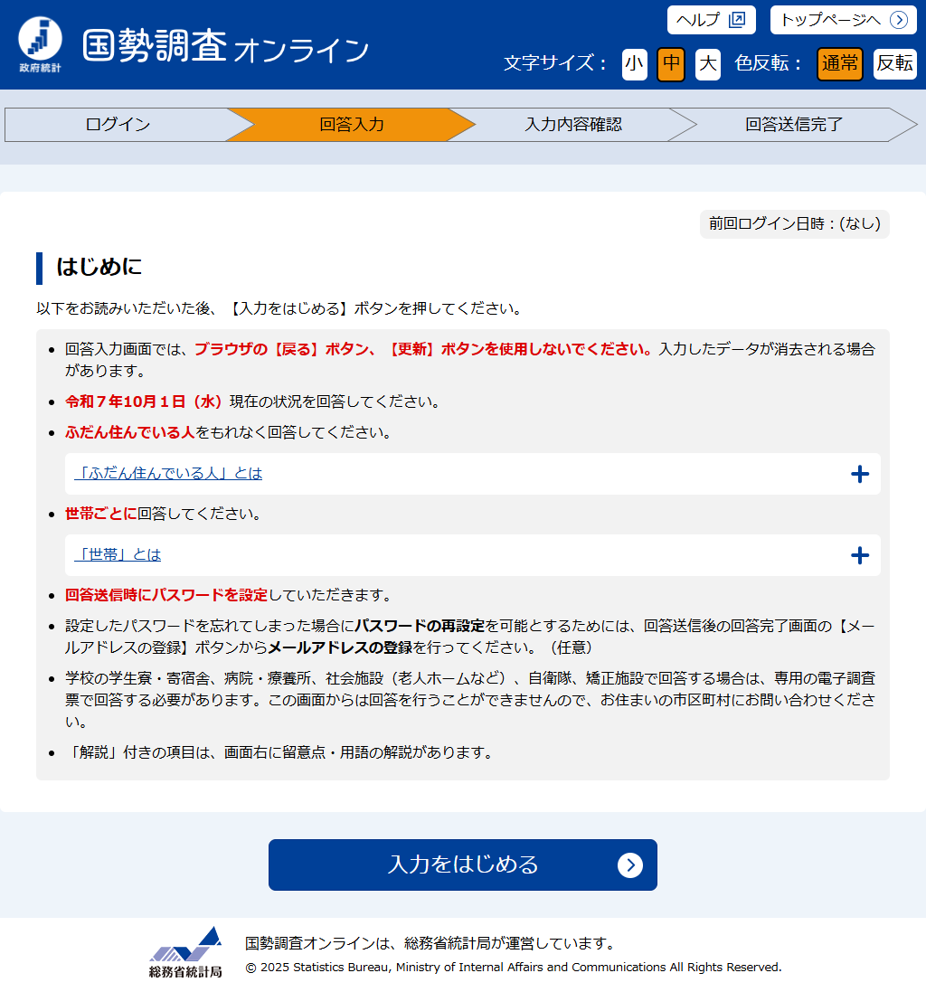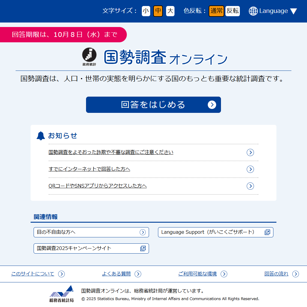 国勢調査オンライン(以下「本システム」という。)を利用して国勢調査の回答を行うためには、下記の利用規約のすべての条項に同意していただくことが必要です。本システムを利用された方は、下記利用規約に同意したものとみなされます。