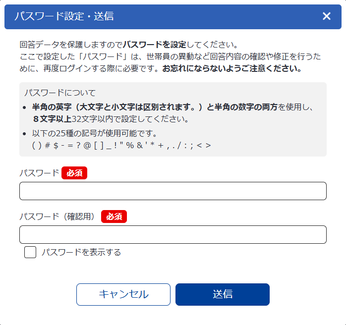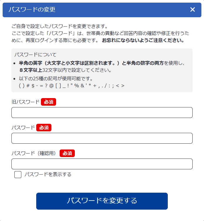 - 五「パスワード」とは、回答内容の保護及びシステム利用者が回答内容を修正する際の認証に用いるシステム利用者自身が設定する文字列をいう。